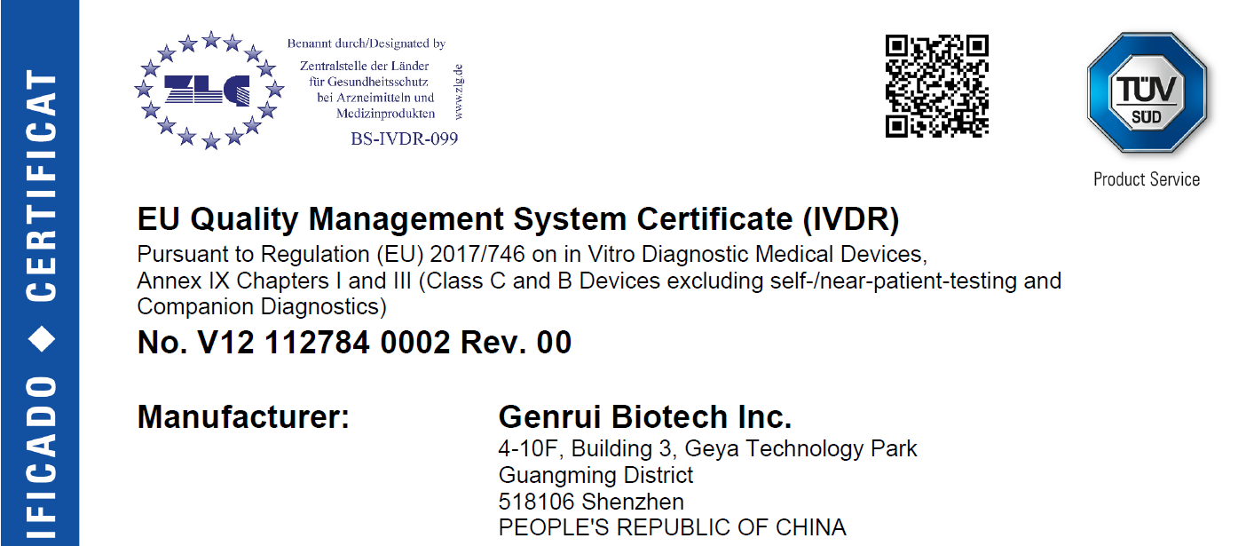 近日,锦瑞生物多项产品通过了IVDR CE B/C类认证,公司收到了由欧盟公告机构TÜV南德意志集团颁发的IVDR CE证书,其中包括三分类血液分析仪系列产品以及多项特定蛋白检测试剂。