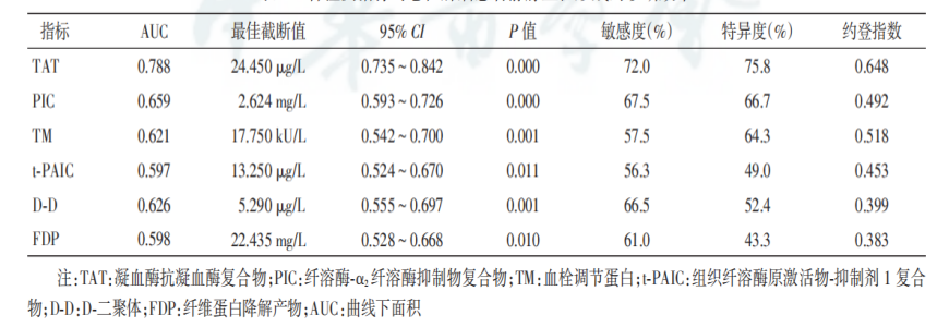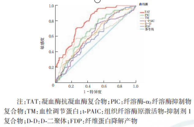 TAT、PIC、TM、t-PAIC、D-D和FDP诊断恶性肿瘤患者静脉血栓形成的曲线下面积(AUC)分别为0.788、0.659、0.621、0.597、0.626和0.598,见表1、图1。