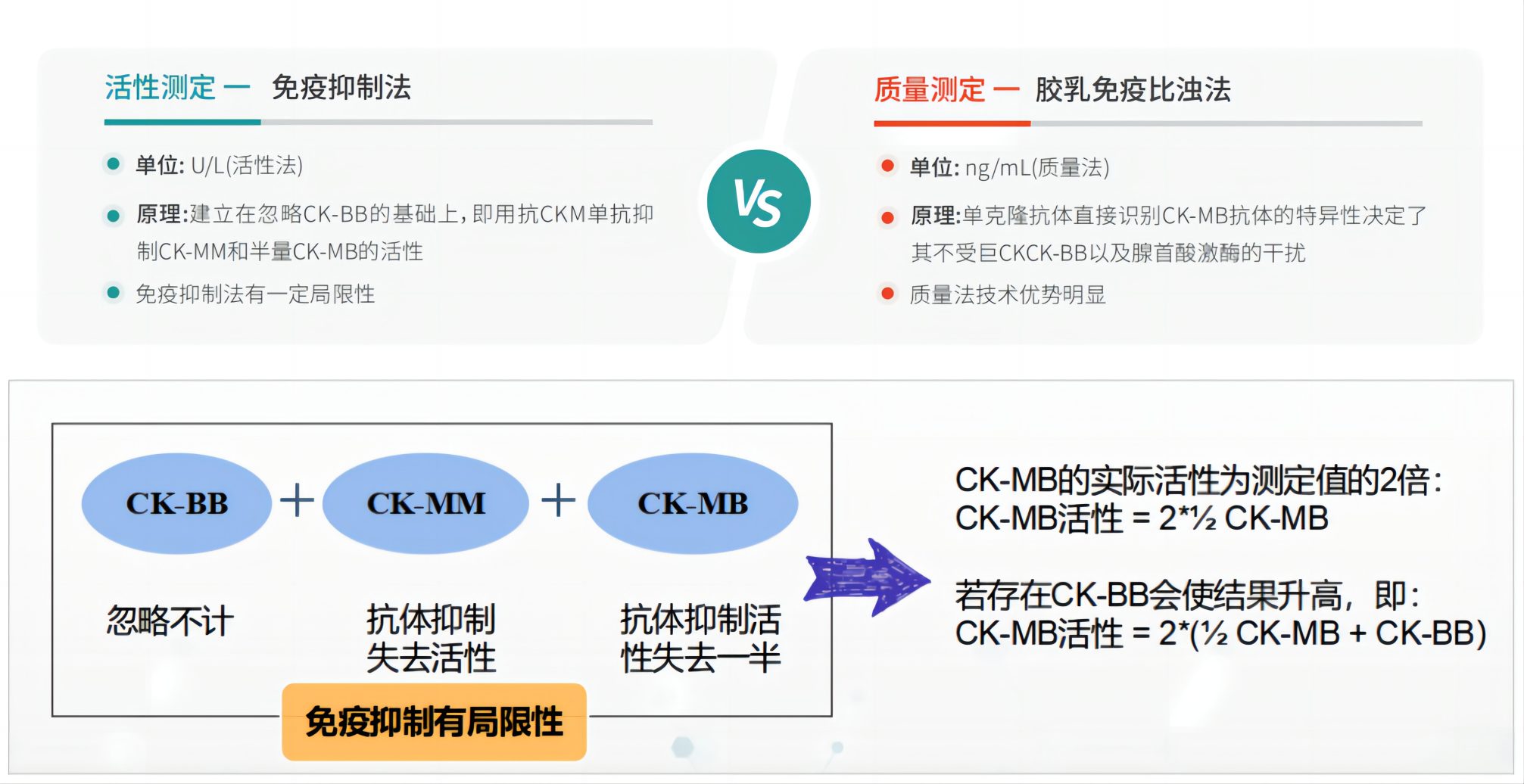 肌酸激酶(CK)检测有2种方法(活性法和质量法)。目前全国约有一半的实验室使用活性法(免疫抑制法)来检测CKMB,但活性法常受多种干扰因素的影响,导致部分结果不准确。而质量法相比活性法优势明显,不仅敏感度高、特异性高,且不受CKBB、巨CK以及腺甘酸激酶的干扰。