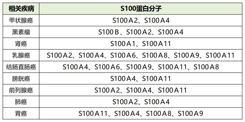 目前已知的对肿瘤起促进作用是S100A4、S100A7、S100A8、S100A9、S100A13,起抑制作用的是S100A2,但也有报道称其有促进肿瘤作用。S100A6、S100A11、S100B既有促进也有抑制作用。S100A6、S100A8、S100A9多聚集于肿瘤边缘,推测与肿瘤侵袭性有关,但机制不明。