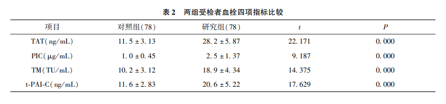 两组受检者血栓四项指标比较(表 2)研究组患者血栓四项指标(TAT、PIC、TM、t-PAI-C)均高于对照组(P< 0. 05)。