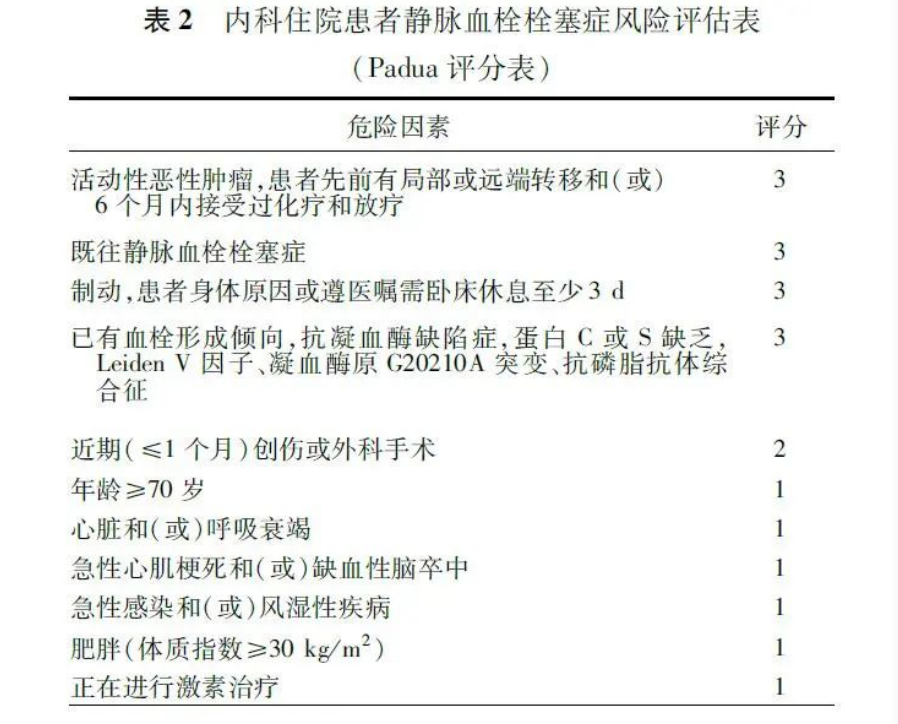 Padua风险评估模型根据患者临床症状、病史对其进行量化评分并评估其VTE风险,可以有效的筛选出内科住院患者VTE的高危人群。但有国内研究显示其特异度较低,多项危险因素在VTE与非VTE患者间并无显著差异,对内科住院患者VTE风险分层的价值有限。
