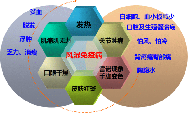 风湿免疫性疾病特别是弥漫性结缔组织病(CTD),可累及全身各个系统和器官。风湿免疫性疾病实际是一组以“非感染、非肿瘤性炎症”为特征的疾病,包括200多个病种,如系统性红斑狼疮、干燥综合征、类风湿关节炎、强直性脊柱炎等,且新的病种也在逐年增加,如抗磷脂综合征等。