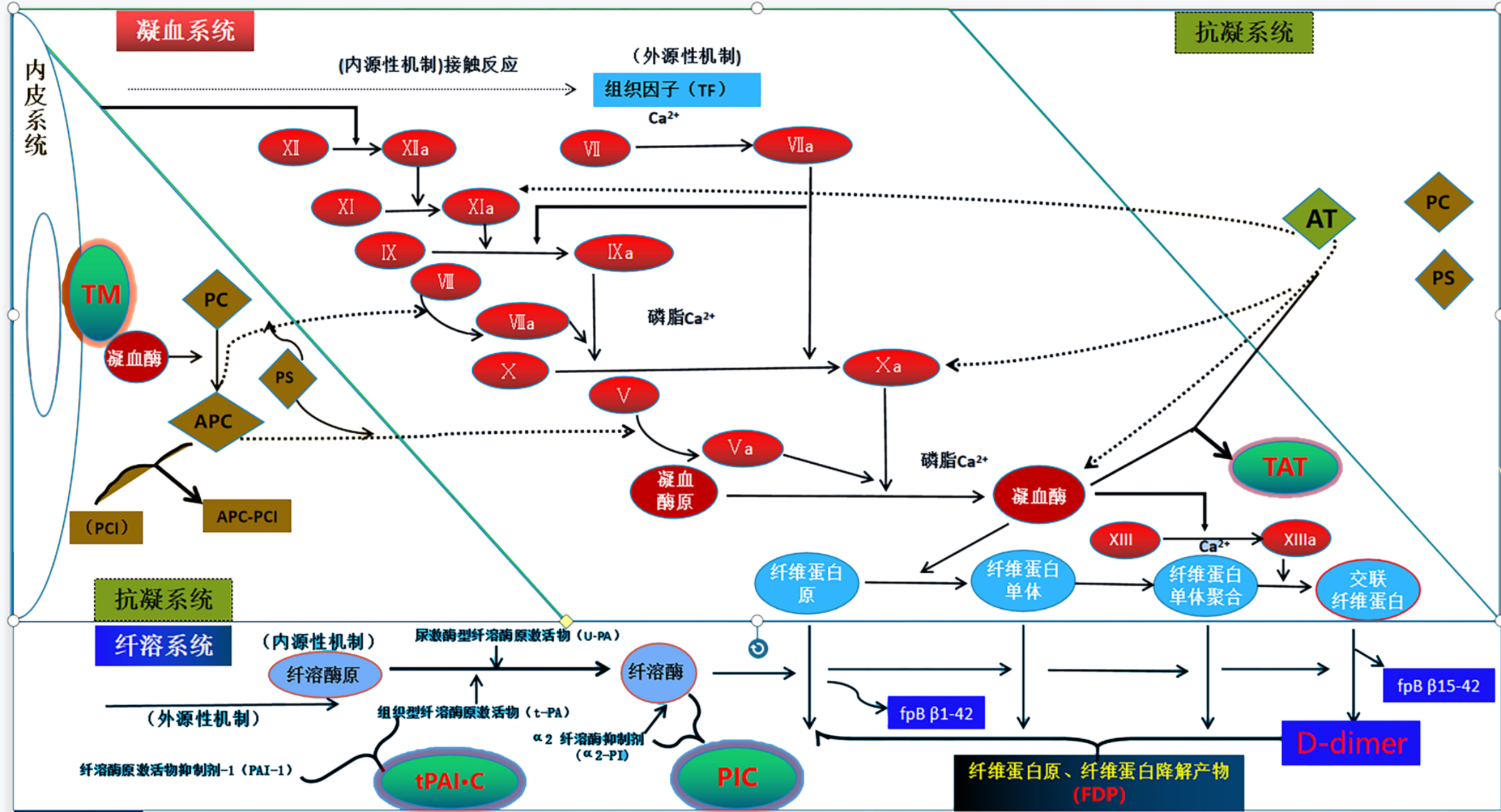血管内皮细胞释放到血液的t-PA与生理性抑制因子纤溶酶原激活物抑制剂-1(PAI-1)迅速以1:1结合,PAI-1的浓度是t-PA的5倍,所以释放到血液中的t-PA几乎都与PAI-1形成了复合物tPAI•C。tPAI•C 复合物增加意味着血液中t-PA浓度增加,即是纤溶系统分子标志物,也是血管内皮细胞受损的分子标志物。 tPAI•C增高见于: (1)DIC、DIC前状态。 (2)动静脉血栓(DVT,急性心肌梗塞)。 (3)血管内皮细胞损伤。 |